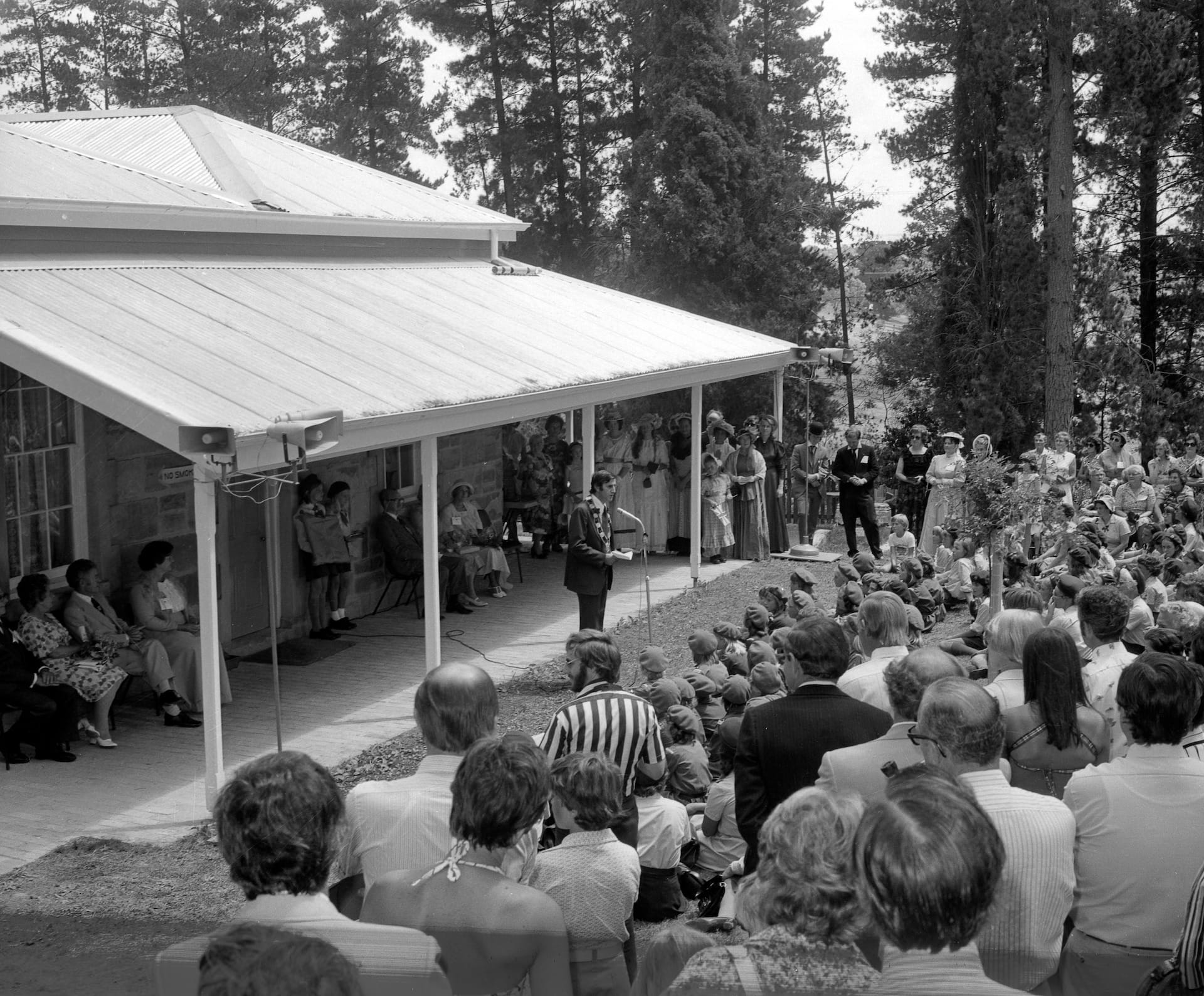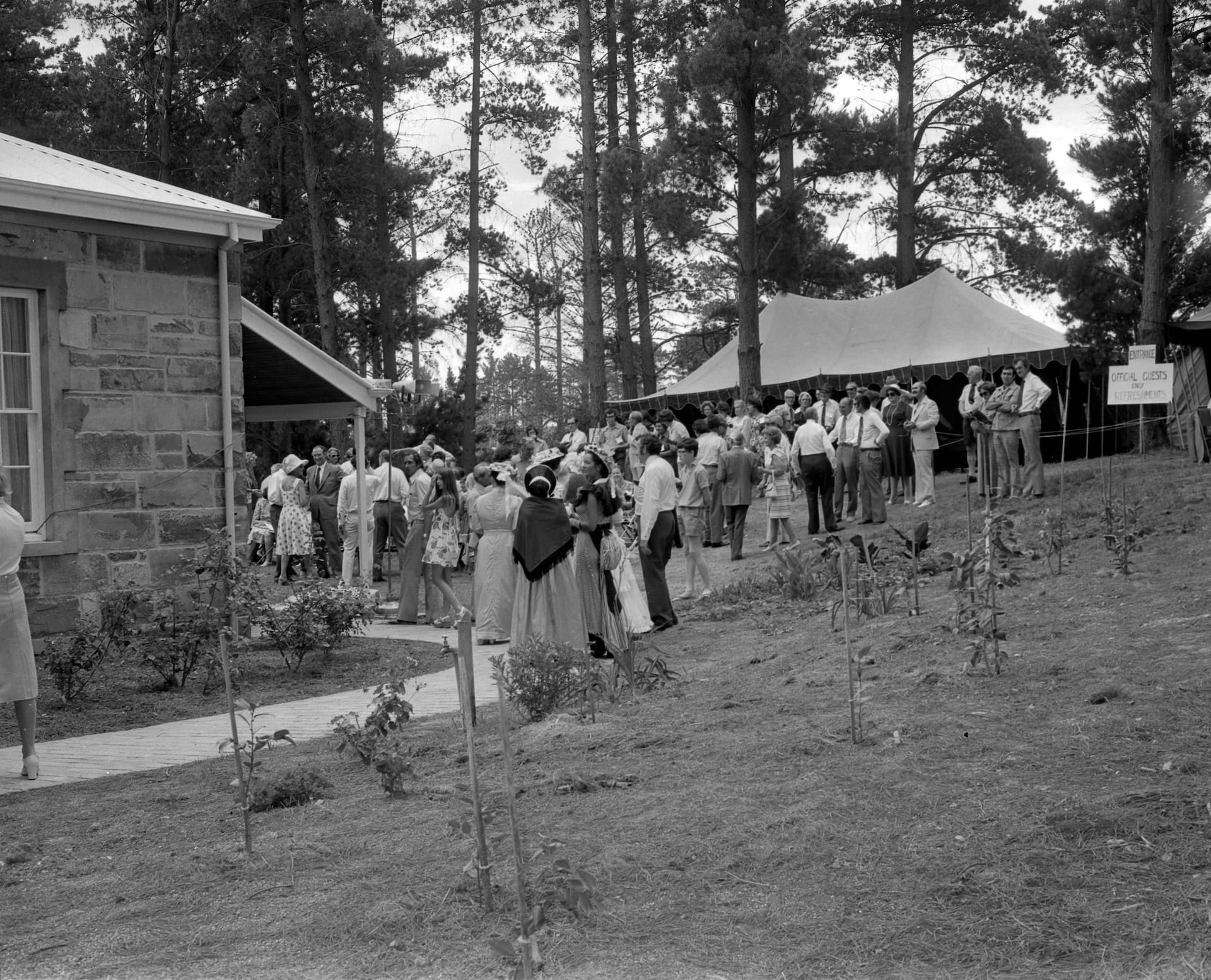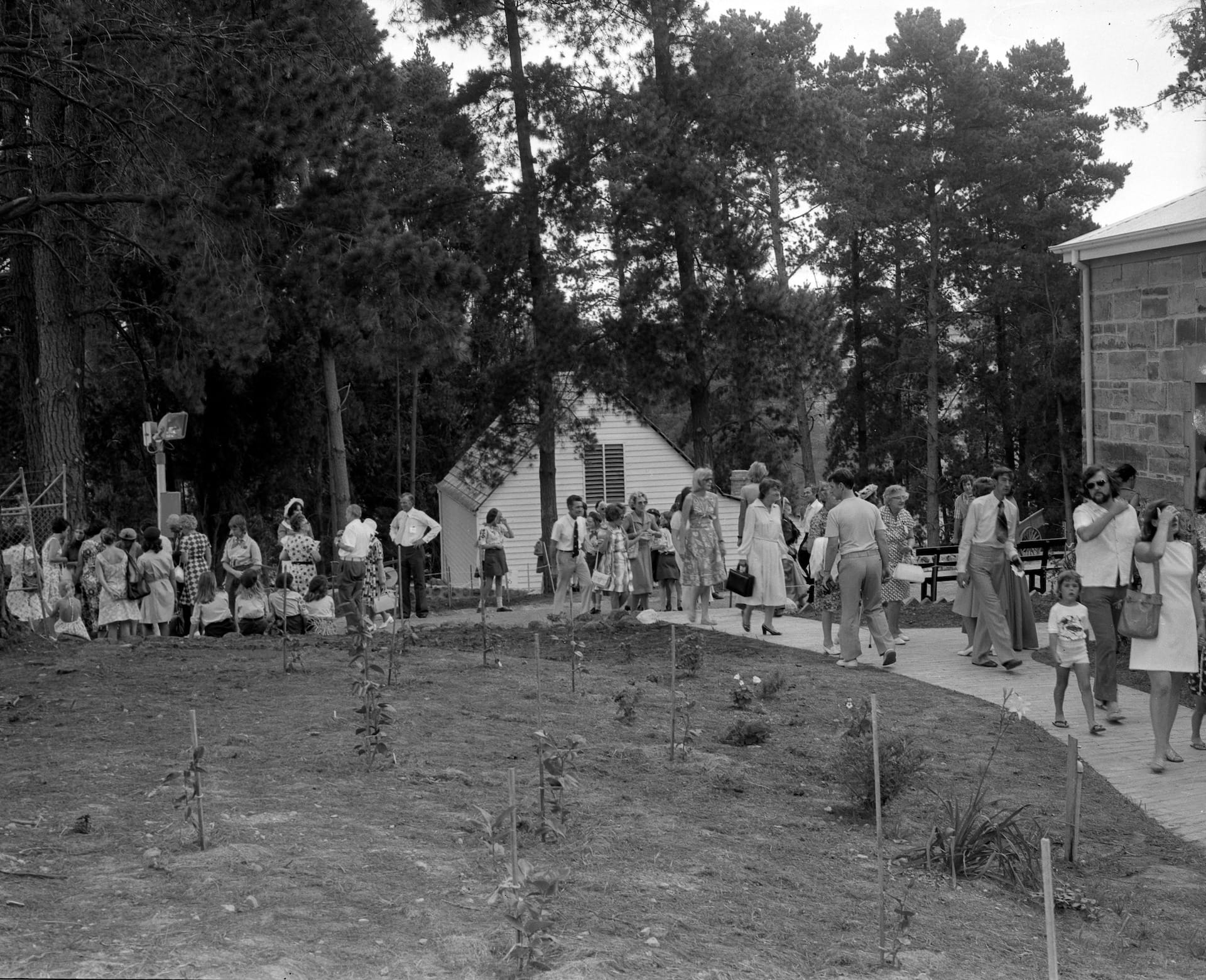 The official opening of Schramm’s Cottage took place on Saturday 14th. February, 1976. A plaque to mark the occasion was unveiled by the Mayor Cr R. Poppins in the presence of over 200 people, and Sir Raymond Garrett MLC formally declared the cottage open and opened the front door with the original key. This day was the climax of five years combined efforts by many people, as there were over one hundred volunteers; mainly from the Doncaster Templestowe Historical Society, who all helped with the removal, rebuilding and setting up of the cottage.
