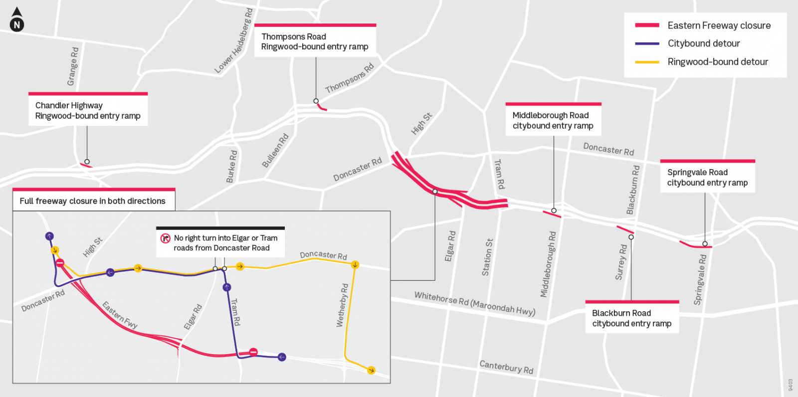 Local drivers are advised to plan ahead and avoid the Eastern Freeway this weekend. The freeway will be closed in both directions between Doncaster Road and Tram Road from 10 pm Friday, 5 September, until 5 am Monday, 8 September.
