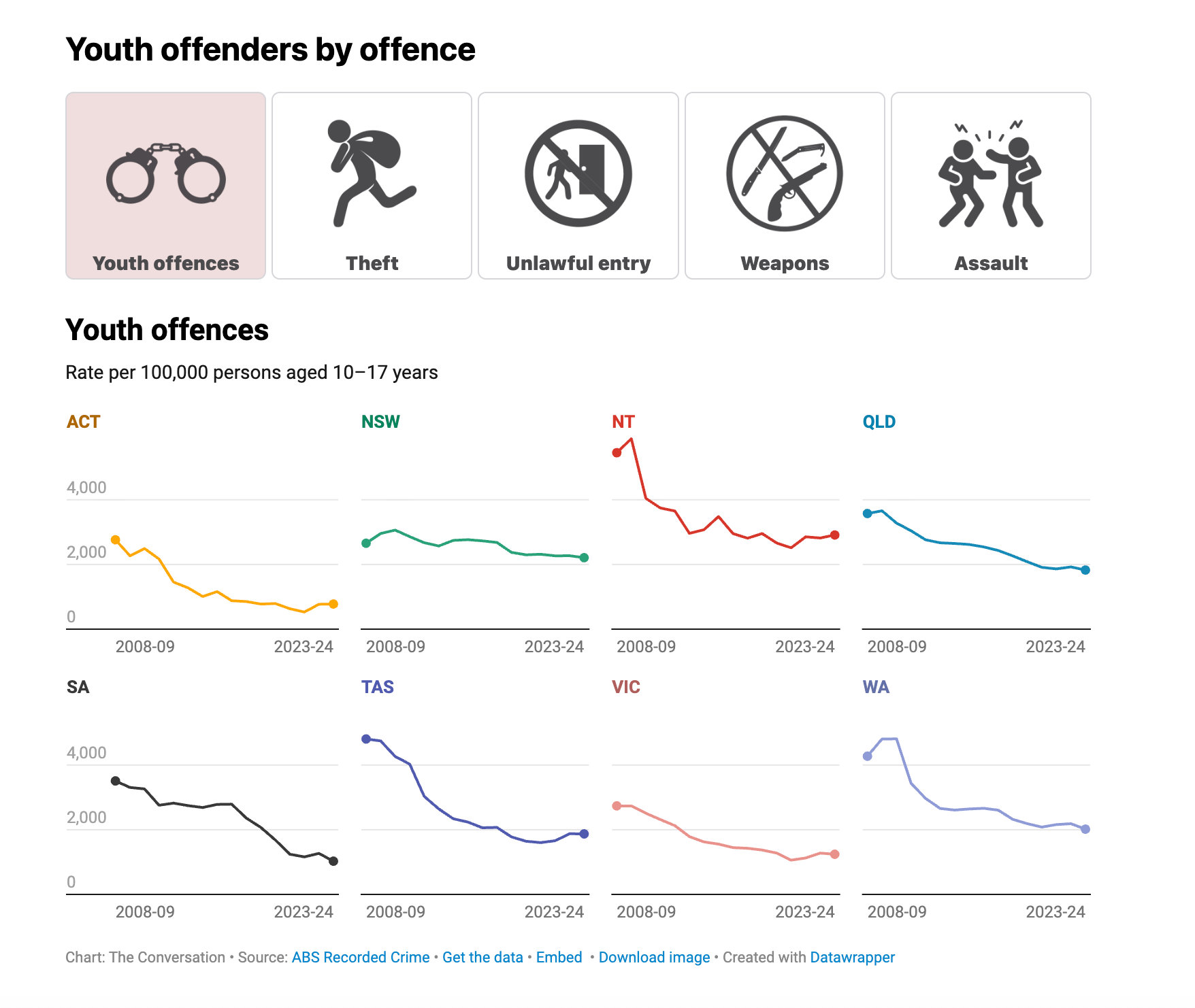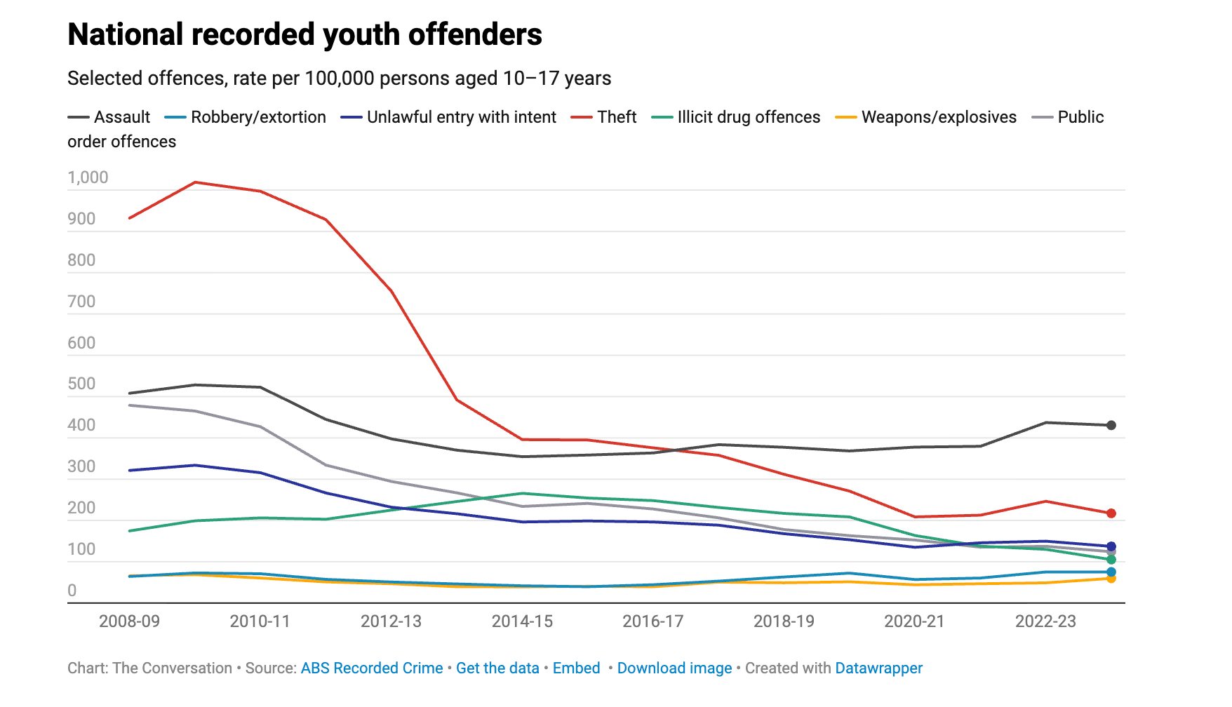 According to latest Australian Bureau of Statistics (ABS) data, in 2023–24 there were 1,764 offenders per 100,000 people aged 10–17, down 28% in ten years.
