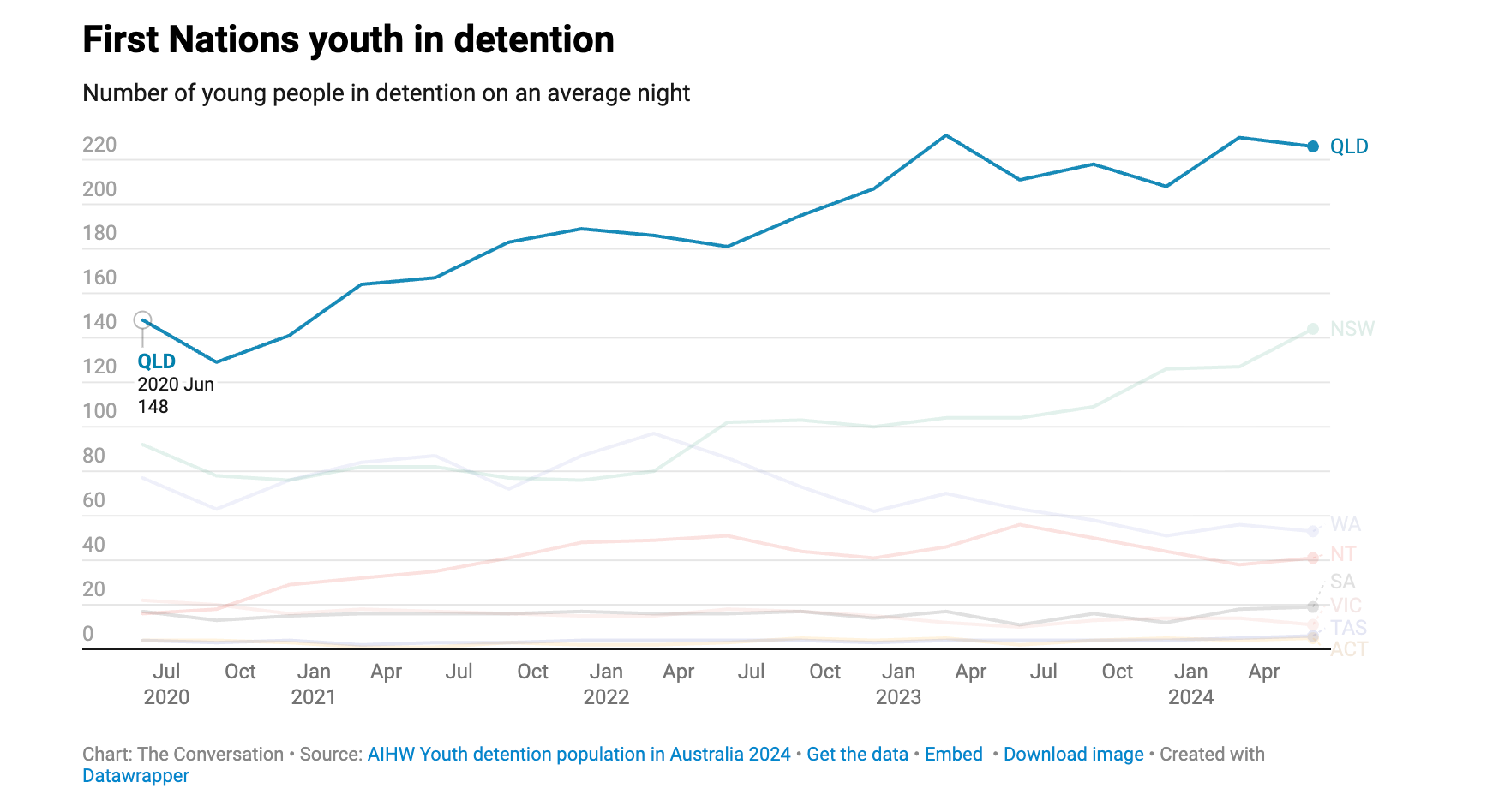 The state with the biggest increase in this period was Queensland, which went from an average of 207 First Nations youth incarcerated in 2020 to 317 in 2024. This equates to 35% of all children incarcerated in Australia.