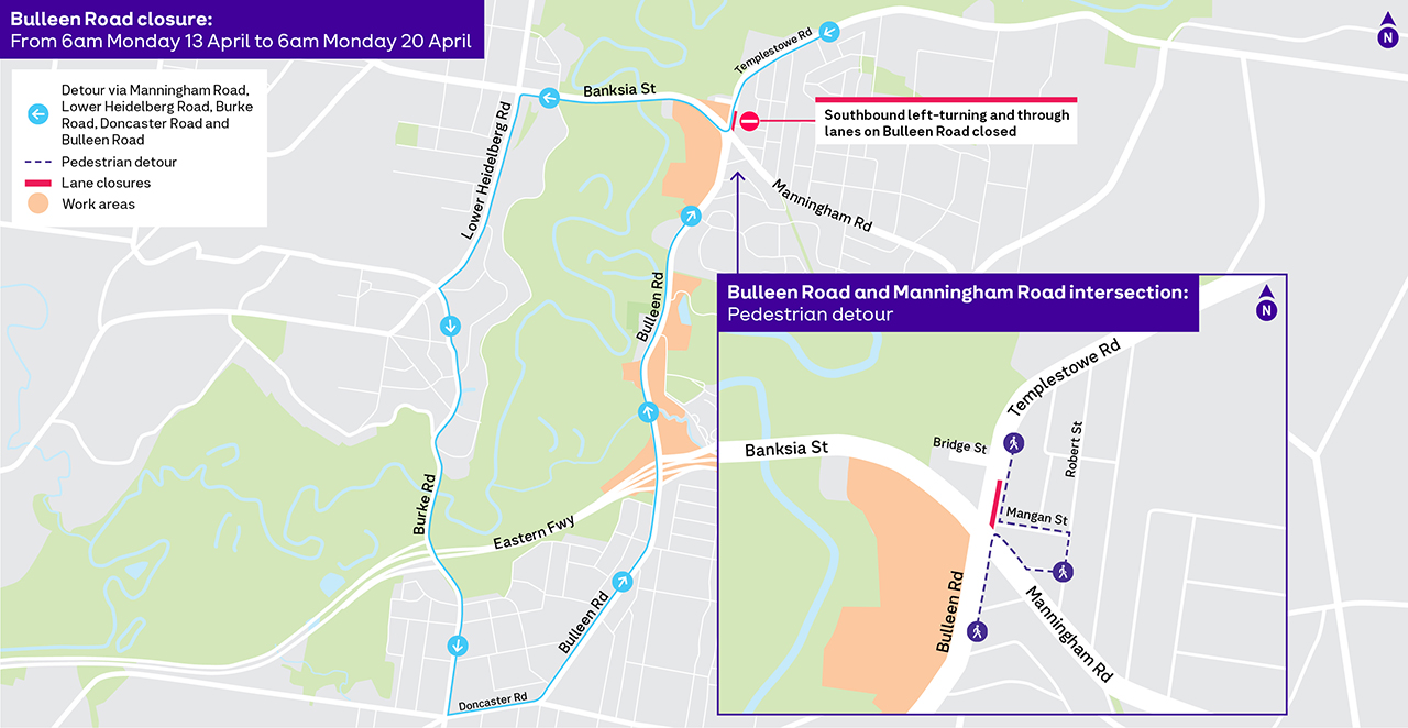 Between 7pm Thursday 9 April 2026 to 6am Monday 20 April 2026, the straight & left turning southbound lanes on Bulleen Road, between Bridge Street and Manningham Road, will be closed 24/7. You will only be able to turn right onto Manningham Road towards Heidelberg during this time.