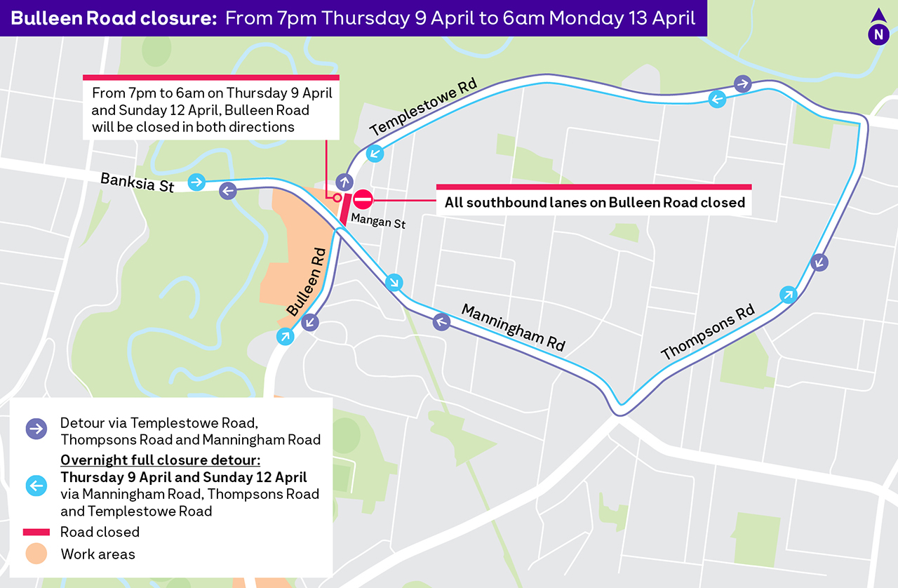 Also on Thursday 9 April 2026 and Sunday 12 April 2026 between 7pm to 6am, Bulleen Road will be closed in both directions between Bridge Street and Manningham Road.