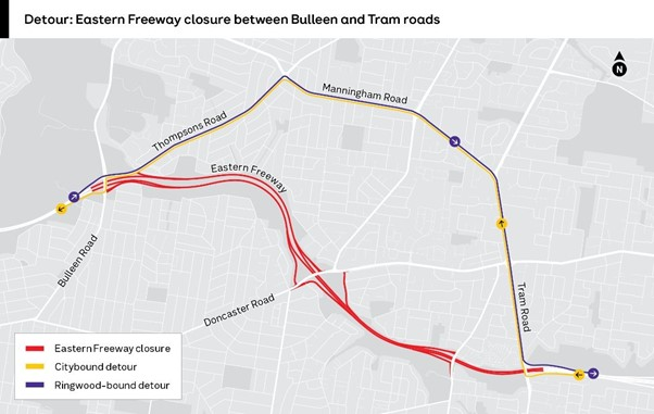 The Eastern Freeway will be closed between Bulleen Road and Tram Road in both directions from 10pm, 17 April 2026 to 5am, 20 April 2026.