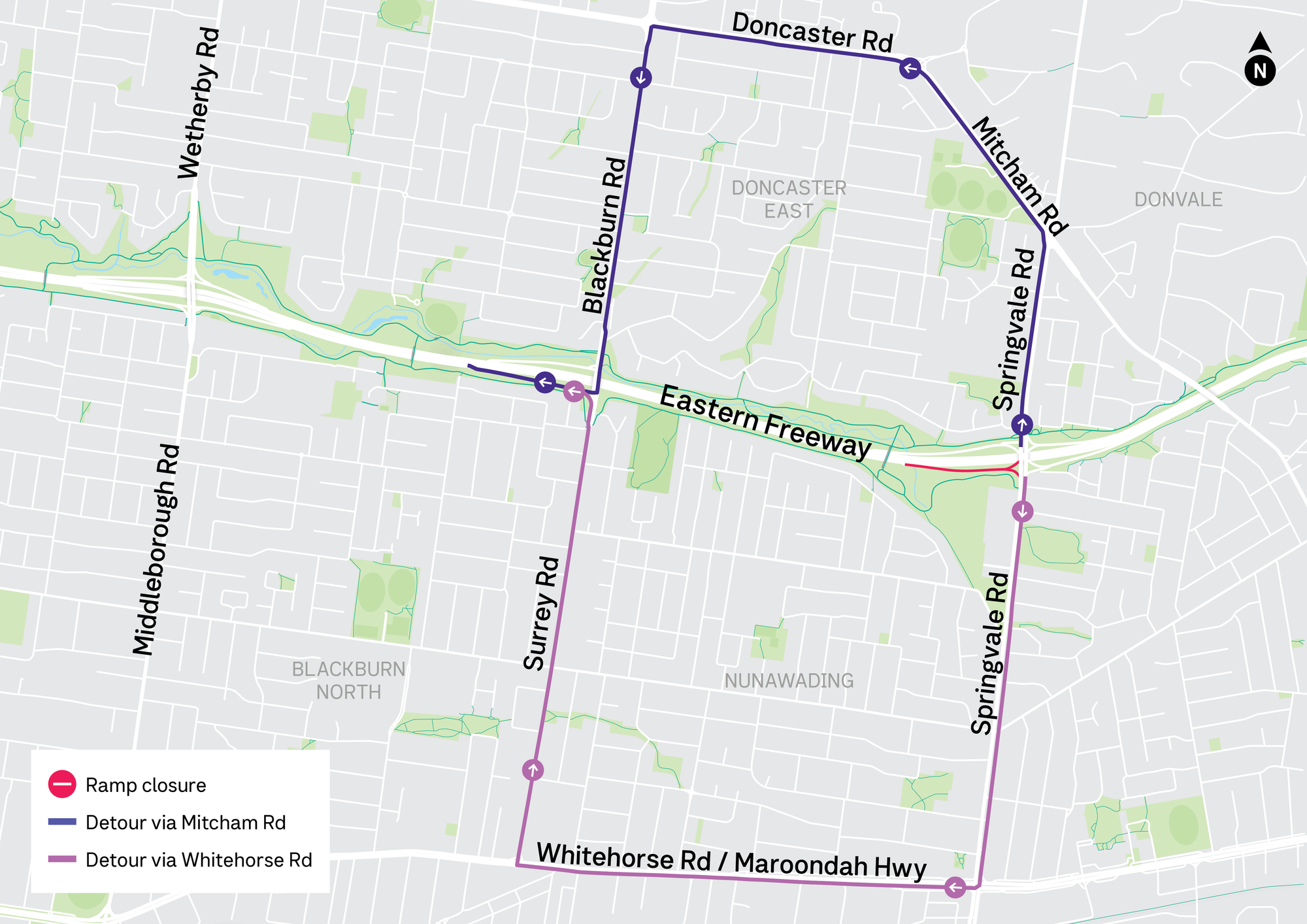 Local drivers are advised to plan ahead and avoid trying to get to the city from the Springvale Road entry ramp onto the Eastern Freeway as it will be closed from 10pm, Wednesday 8 April 2026 to 11.59pm, Friday 24 April 2026.