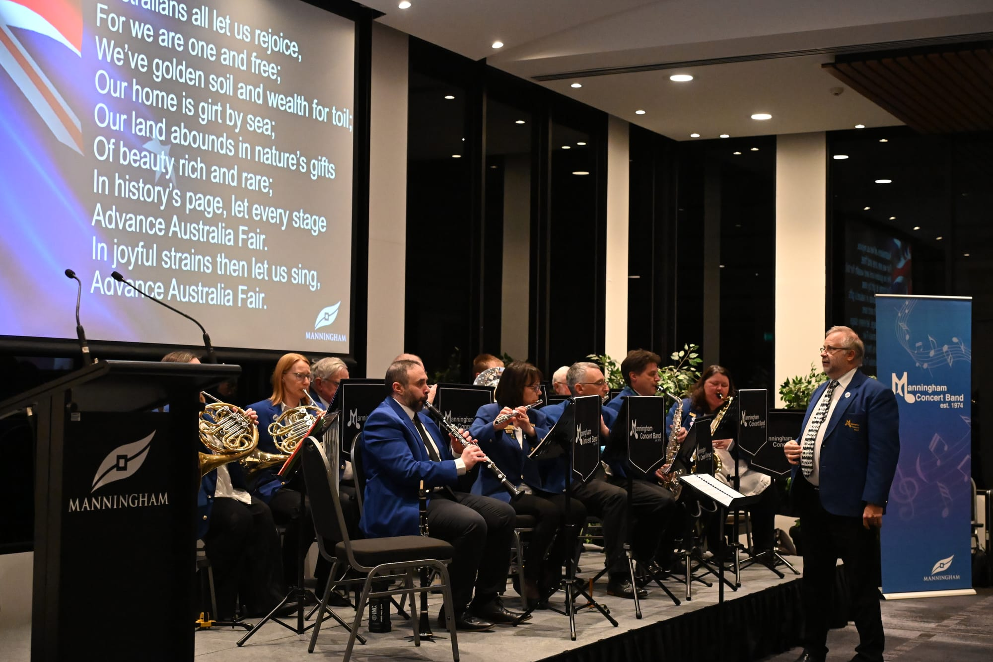 仪式还包括 Manningham Concert Band 的现场表演,为当晚增添了喜庆和振奋人心的氛围。乐队带领全场齐唱国歌,营造出团结与自豪的氛围。