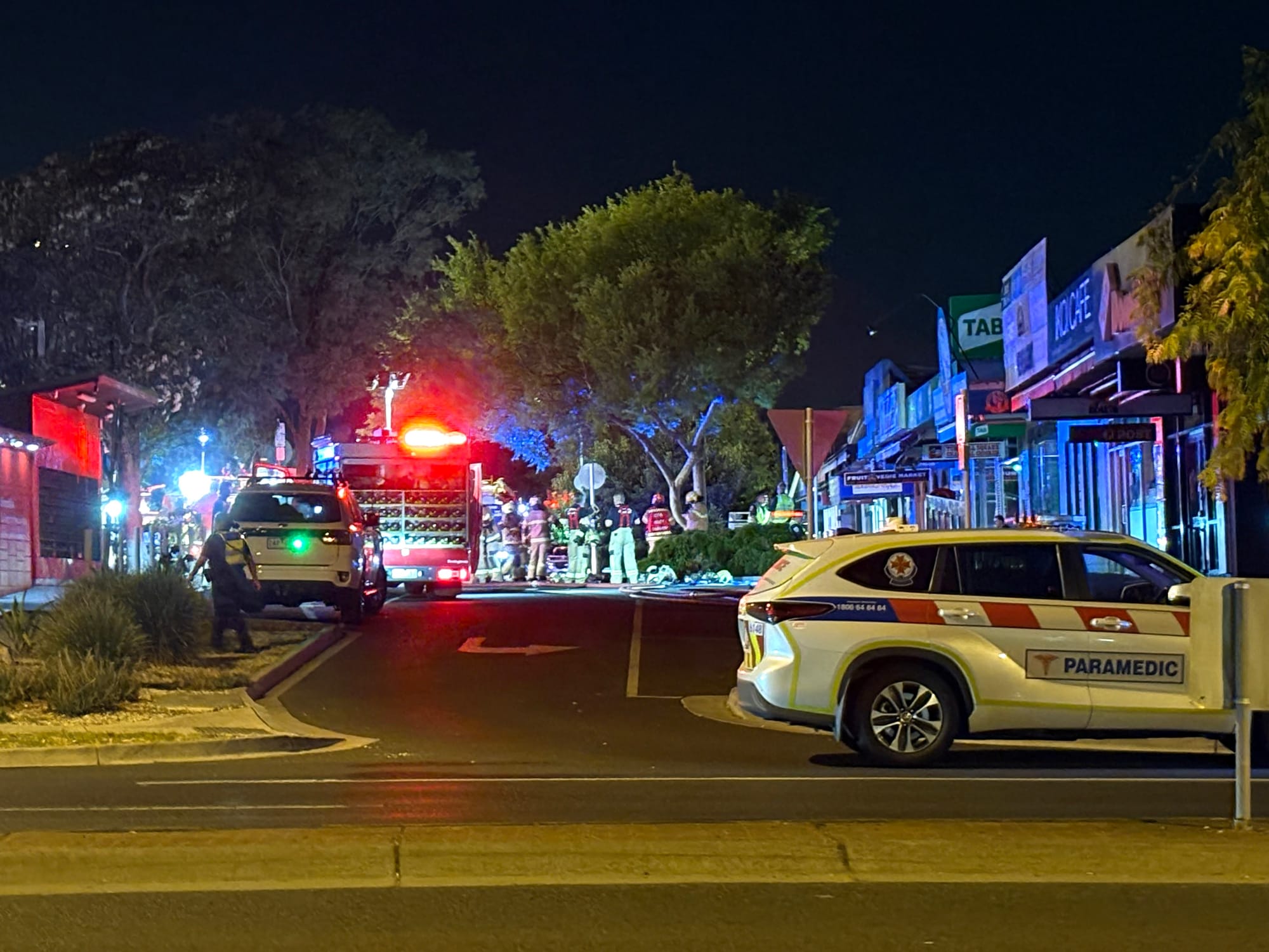 Emergency services were called to Tunstall Road shortly before 9pm following multiple Triple Zero (000) calls reporting a shop well alight. On arrival, firefighters found heavy smoke and flames issuing from the shopping strip, prompting an escalation of the response.