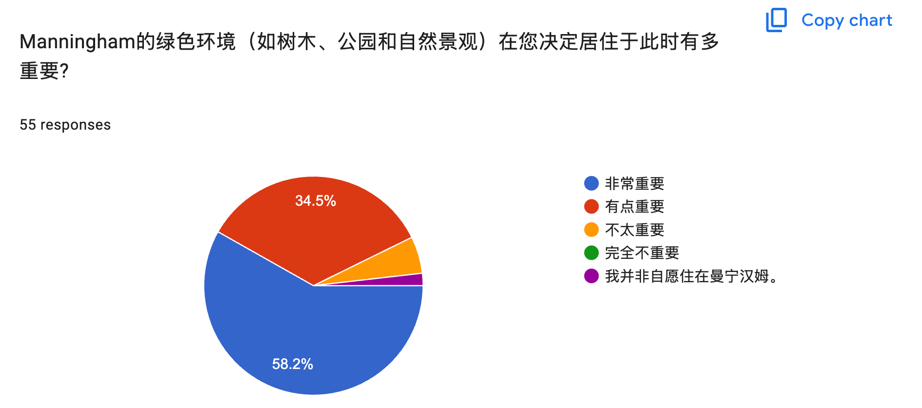 A significant majority of respondents (92.7%) said that Manningham’s green environment was important in their decision to live there, including 58.2% who described it as “very important.” This suggests that trees, parks and natural surroundings are a major factor influencing Chinese residential choice. Even if they have only lived here for a short time, they still consider the environment very important to them.