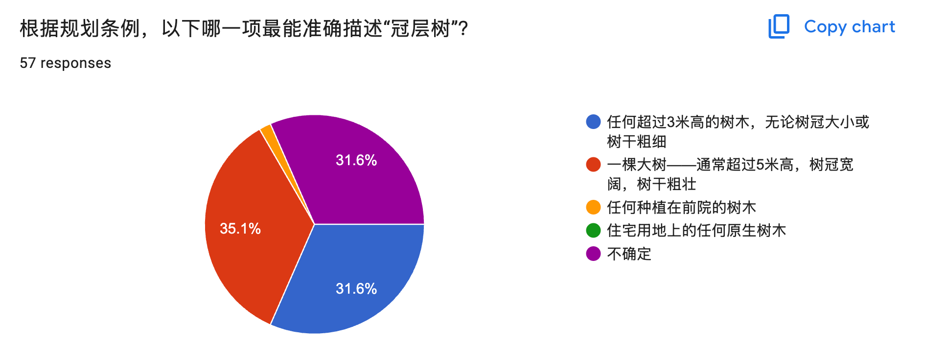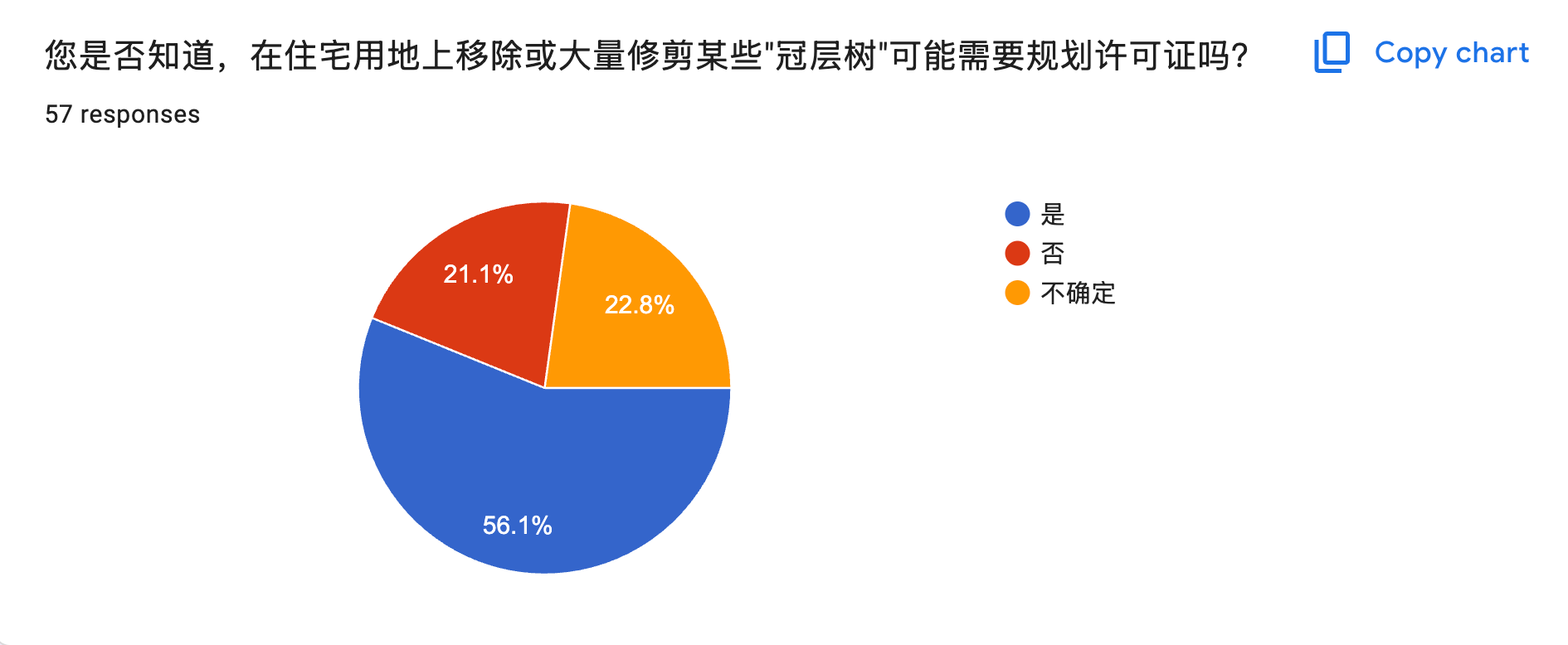 The survey focused on testing participants’ knowledge of whether permits are required for removing or modifying canopy trees, even in the absence of construction plans.