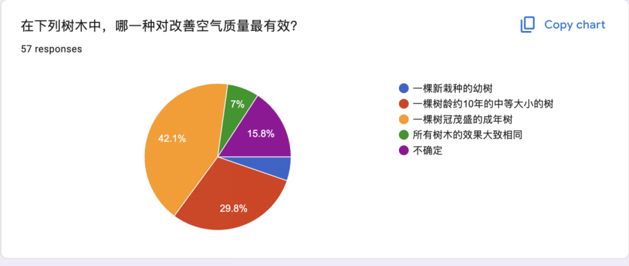 According to the survey from Manningham Life, about 60% of Chinese are unaware of which trees are most beneficial for air quality. Only about 42% of Chinese choose the correct answer, which is ‘mature trees with large canopy’.