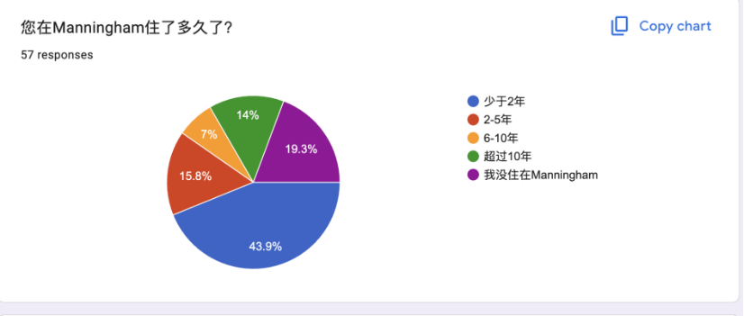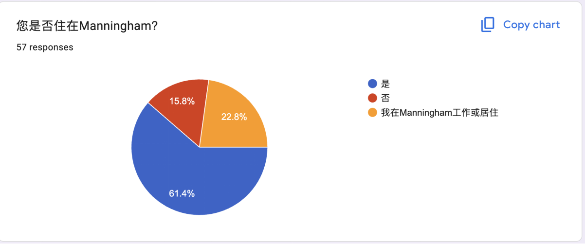 Most of the people who responded to the Chinese-language survey have a clear connection to Manningham. About 61% said they live in the area, with another 23% saying they work or spend time here. Only a small group — around 16% — said they don’t live in Manningham.
