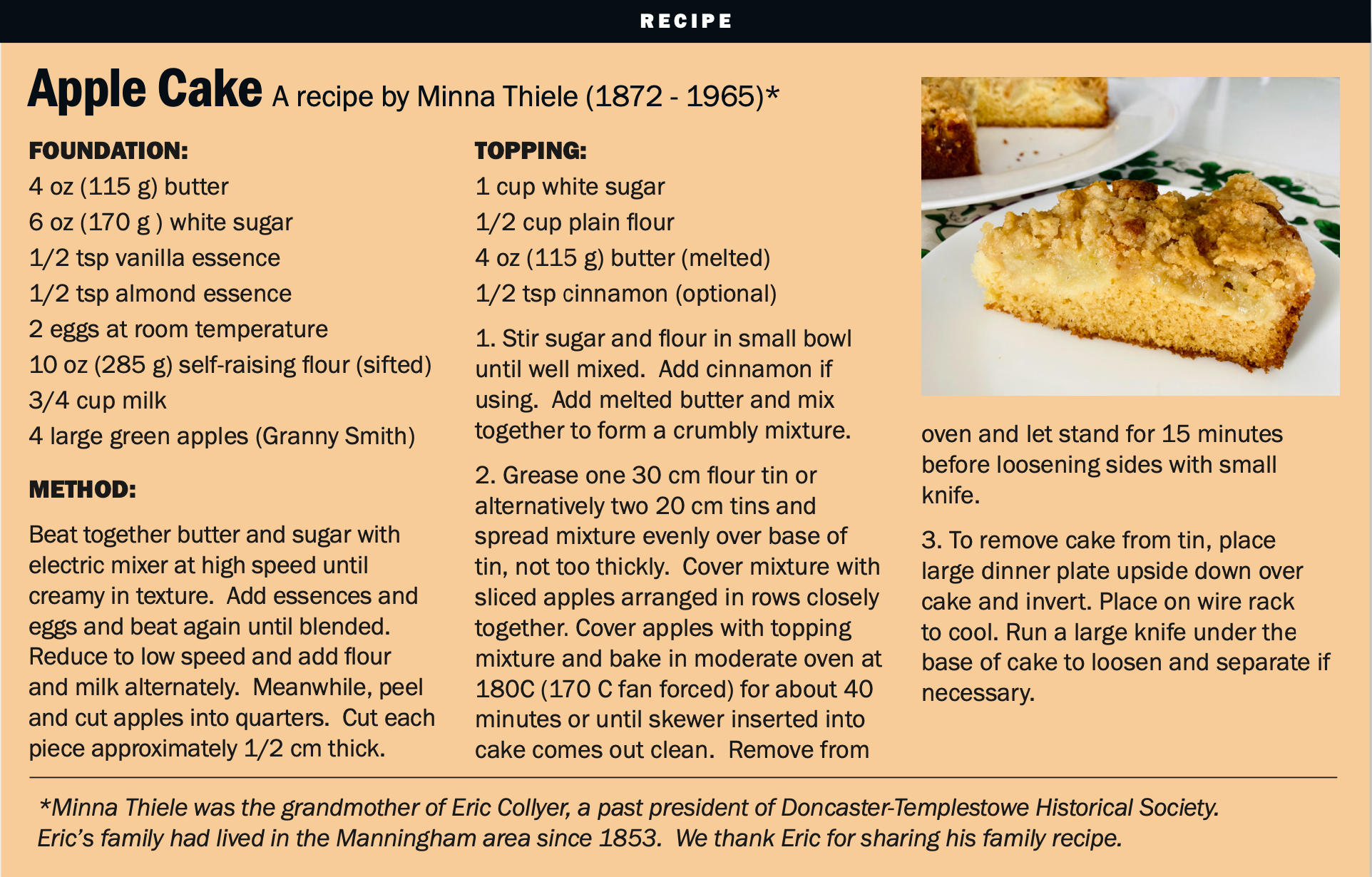 In addition to his significant historical contributions, Eric generously shared his grandmother’s apple cake recipe, which we published in the May/June 2023 issue (Issue 11). Written in his elegant handwriting, Eric mailed the recipe to us from Adelaide, where he had moved to be closer to his family. For those interested, we are pleased to share the recipe once more.