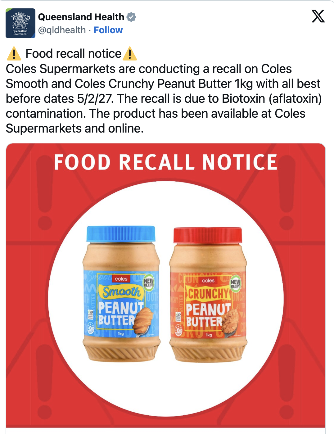 The supermarket chain has issued the recall notice for Coles Smooth Peanut Butter 1kg and Coles Crunchy Peanut Butter 1kg, with the best before date of February 5 2027. They were sold in supermarkets and online nationally between May 1 and June 30 this year.