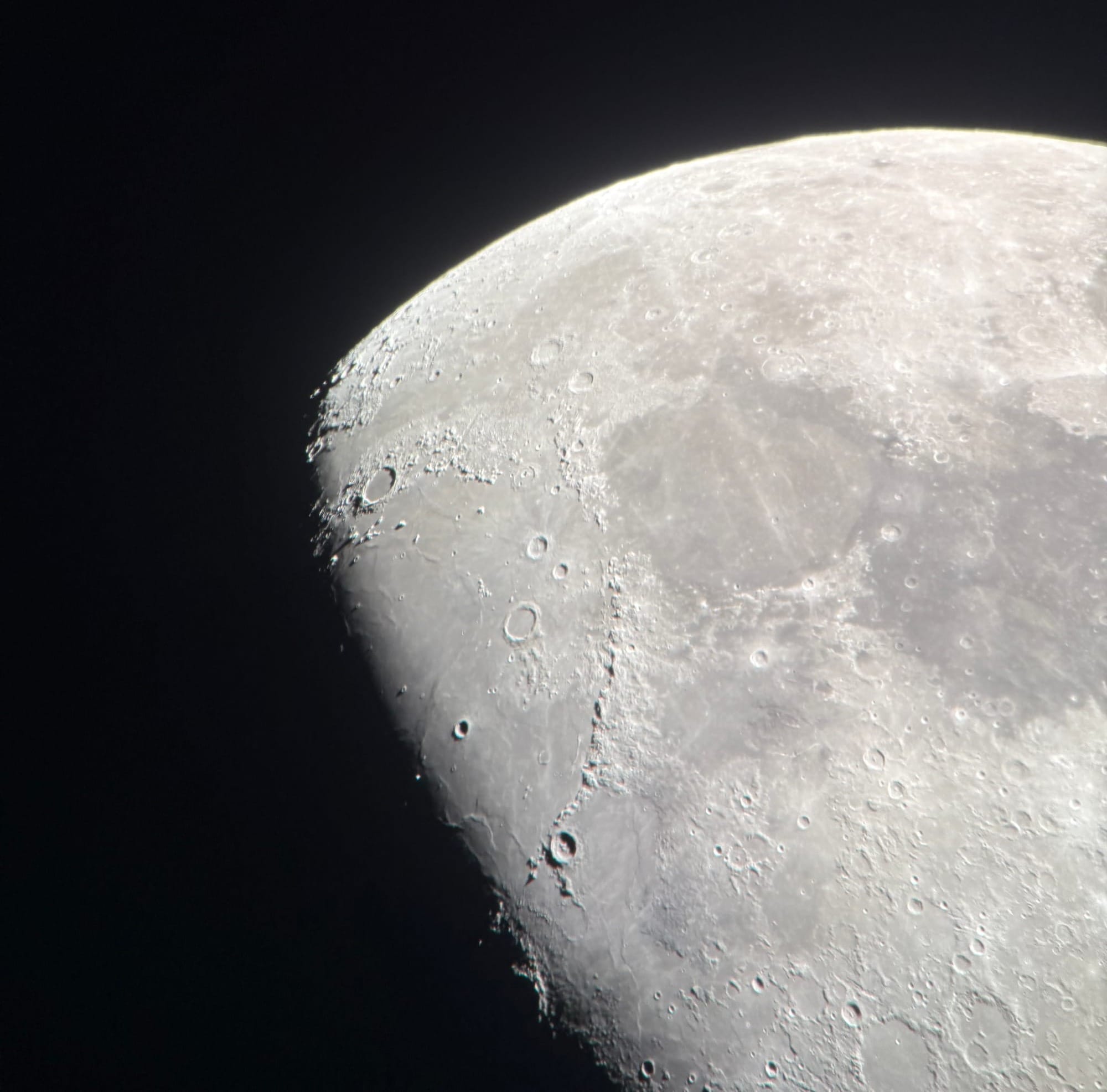 最后,我们把望远镜转向月球。月面亮得几乎让人难以直视。透过望远镜,月球表面清晰而富有层次:陨石坑、山脊、阴影,一切都纤毫毕现。它不再只是我们平日熟悉的、遥远而扁平的圆盘,而是一个相当细致且真实的天体。