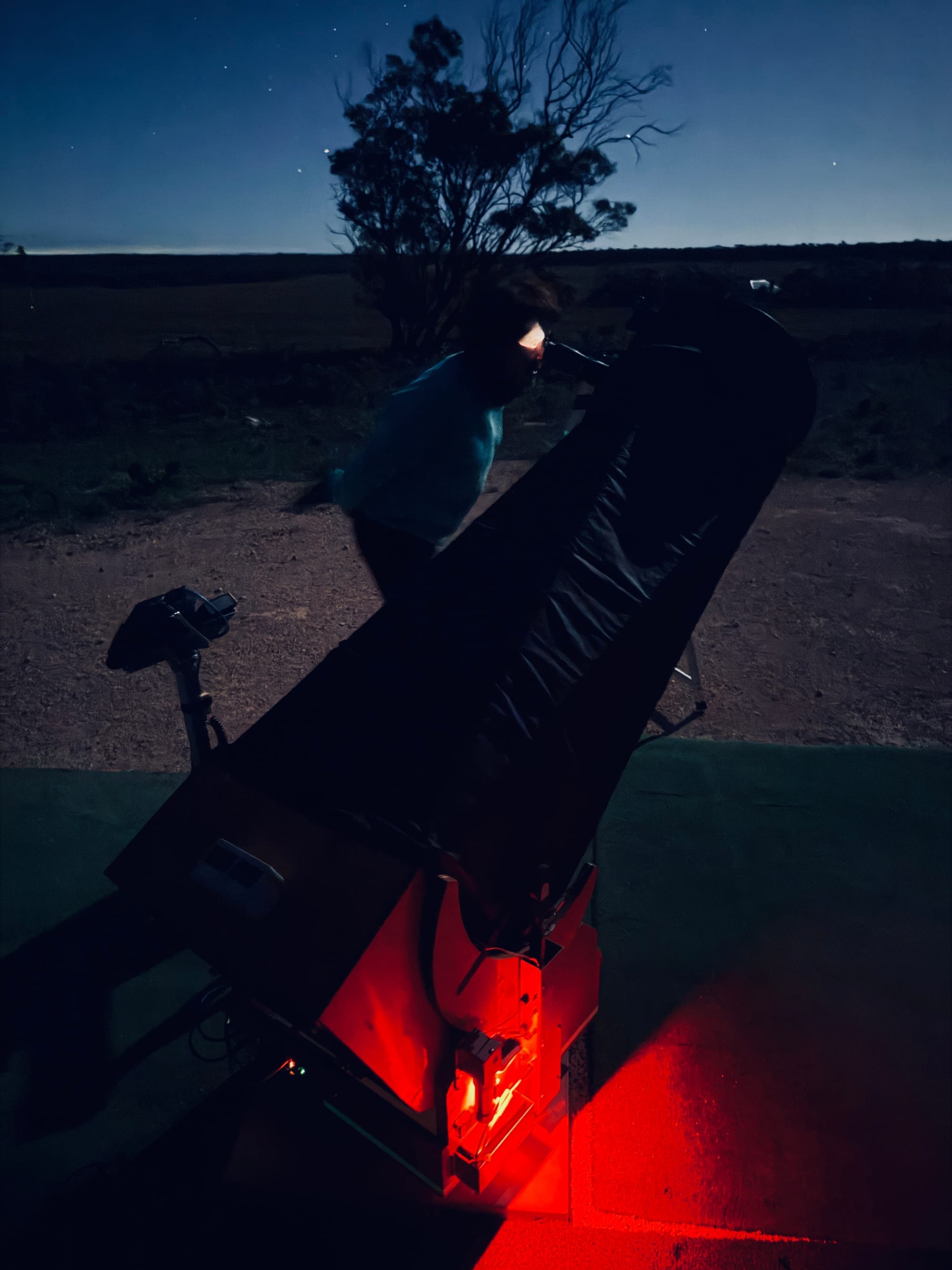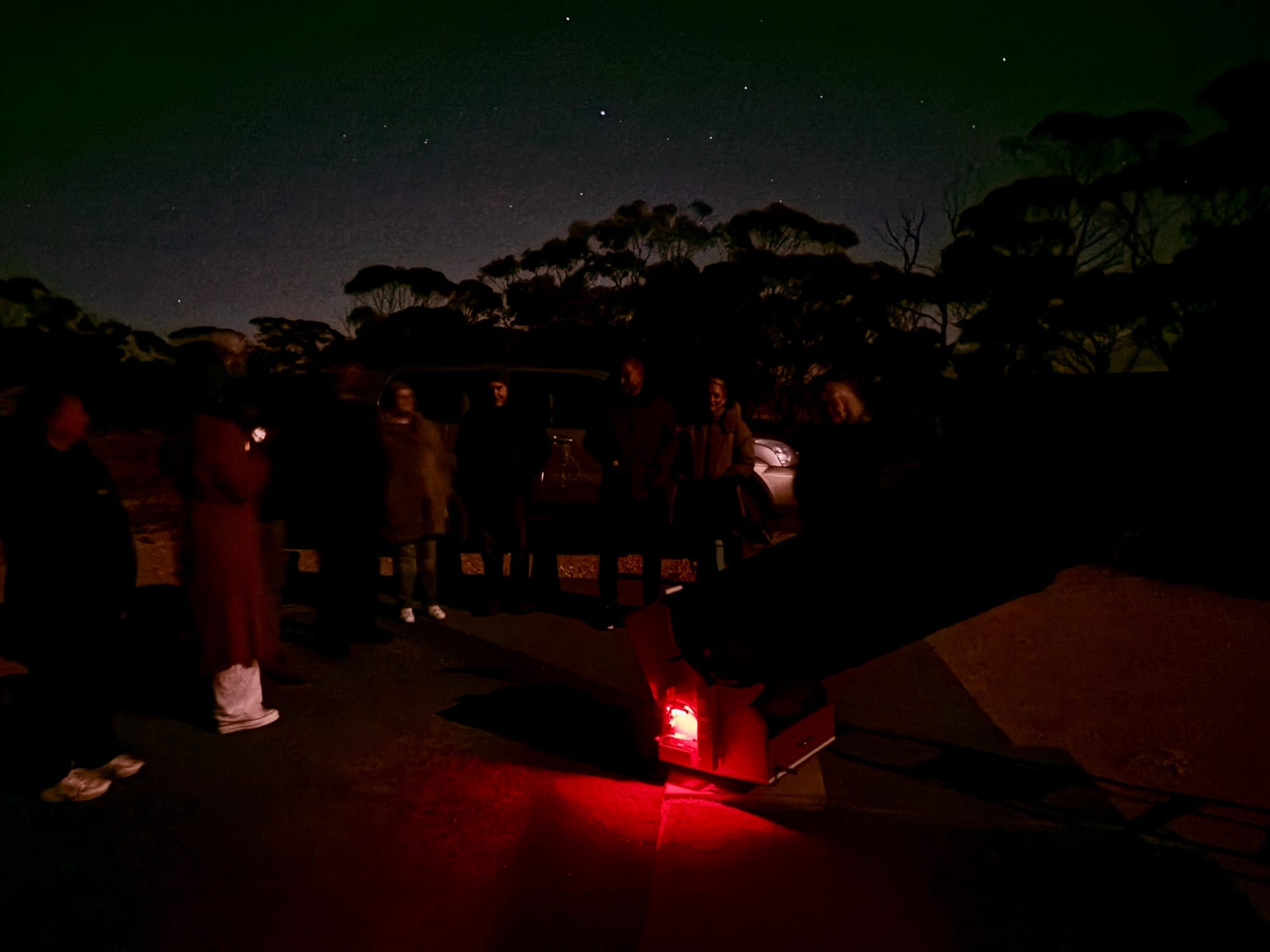 期间,Lyn端来了热巧克力。坦白说,那简直像是救星。那时气温已经降到10摄氏度左右,甚至可能更低,而我完全没有为这样的低温做好准备。我把带来的四件长袖上衣全都穿上了。此前在墨累布里奇经历的是30多摄氏度的高温,所以我就多带了些适合寒冷天气的衣物。可在那片开阔的保护区里,头顶是晴朗无云的夜空,气温下降得很快。她还拿来了巧克力——Milky Way和Mars Bars,为那个夜晚添了几分暖意,也意外地与主题相呼应。相比之下,Joe则带来了丰富的知识:他慷慨地为我们进行了解释,让我们对所看到的有了更深入的理解。