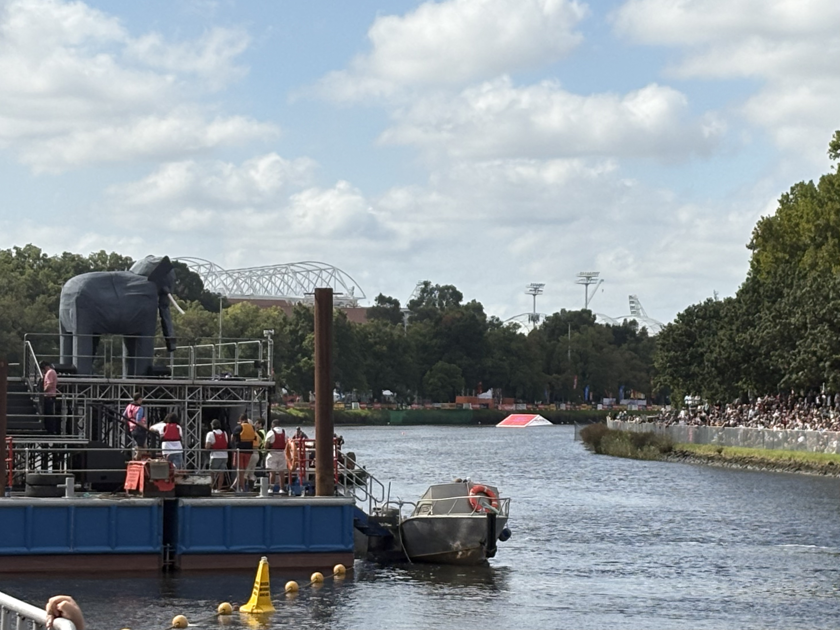 阳光洒在雅拉河上,一架象形飞机矗立在比拉容(Birrarung)平台上。河两岸的人群翘首以盼,等待着上午11点比赛的开始。